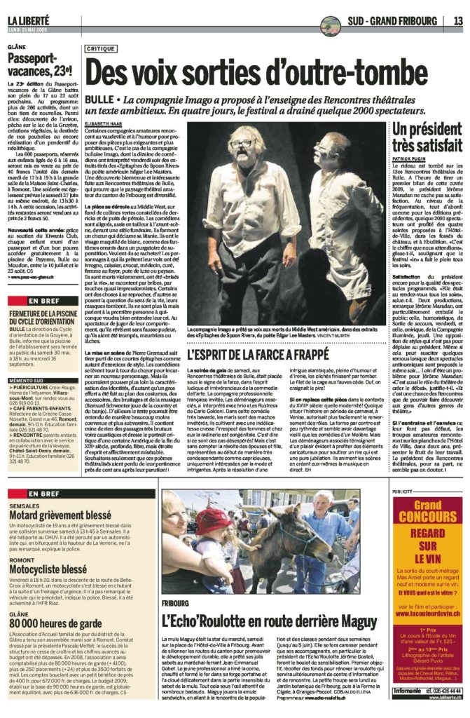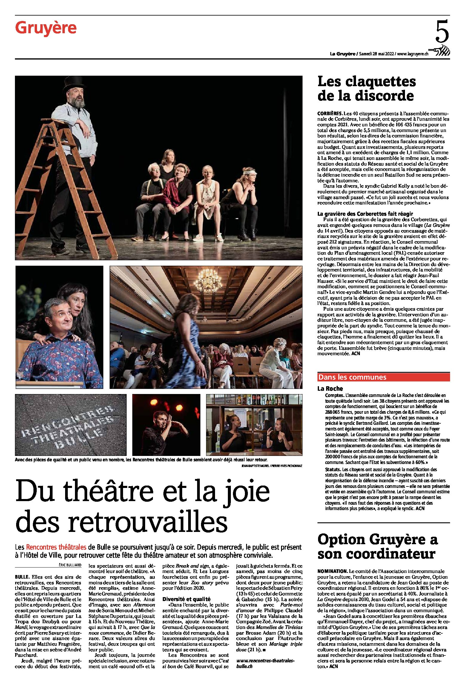 Historique des programmes Programme 2024 Programme 2022 Programme 2018 Programme 2016 Programme 2014 Programme 2011 Programme 2007 Revue de presses Entre Cour et Jardin 01.06.2024 La Gruyère 14.05.2024 La Liberté 13.05.2024 La Gruyère 11.05.2024 La Gruyère 11.05.2024 La Liberté 05.08.2024 La Gruyère 07.05.2024 La Liberté 03.04.2024 La Gruyère 02.04.2024 Le Messager 01.04.2024 La Gruyère 31.05.2022 La Gruyère 28.05.2022 La Liberté 28.05.2022 La Liberté 25.05.2022 La Gruyère 24.05.2022 La Gruyère 24.05.2022 La Gruyère 24.05.2022 Le Messager 20.05.2022 La Liberté 22.03.2022 La Gruyère 12.03.2022 La Liberté 25.04.2018 La Liberté 23.04.2018 La Gruyère 26.04.2016 La Gruyère 23.04.2016 La Gruyère 16.04.2016 La Liberté 14.04.2016 La Gruyère 24.06.2014 La Gruyère 21.06.2014 La Liberté 17.06.2014 La Gruyère 14.06.2014 La Liberté 23.03.2012 La Gruyère 07.06.2011 La Gruyère 04.06.2011 La Gruyère 31.05.2011 La Gruyère 26.05.2011 La Liberté 26.05.2011 La Liberté 25.05.2009 La Liberté 23.05.2009 La Liberté 20.05.2009 La Gruyère 16.05.2009 La Gruyère 12.05.2009 La Gruyère 19.05.2007 La Gruyère 23.05.2005 La Gruyère 10.05.2005 La Gruyère 05.05.2005 La Gruyère 03.05.2005 La Gruyère 26.04.2005 Contactez-nous! Nom Adresse e-mail Message 5 + 11 = Envoi Trouvez-nous! Tous les spectacles ont lieu à l’ Hôtel de Ville de Bulle, Grand-Rue 7, 1630 Bulle Coordonnées GPS : 46.61810723264805, 7.057202998185303